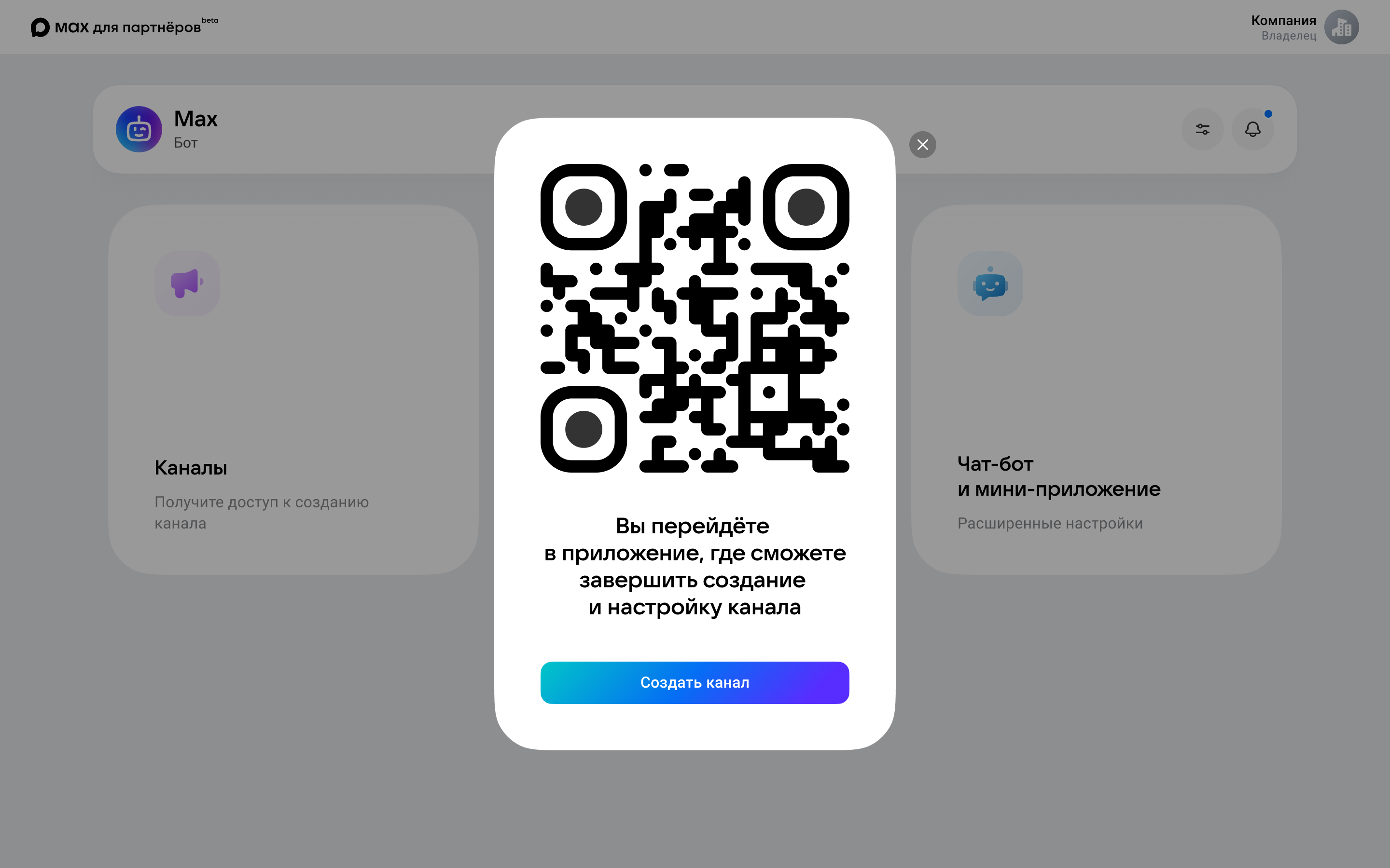 - Отсканируйте QR-код или нажмите кнопку — вы перейдёте в бота для создания каналов в MAX