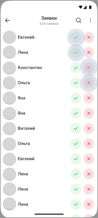 Чтобы одобрить заявку, нажмите на галочку — пользователь будет сразу добавлен в канал и получит уведомление о вступлении. Чтобы отклонить заявку, нажмите на крестик — заявка будет сразу удалена. В этом случае пользователь не получит никаких уведомлений, но сможет подать заявку повторно